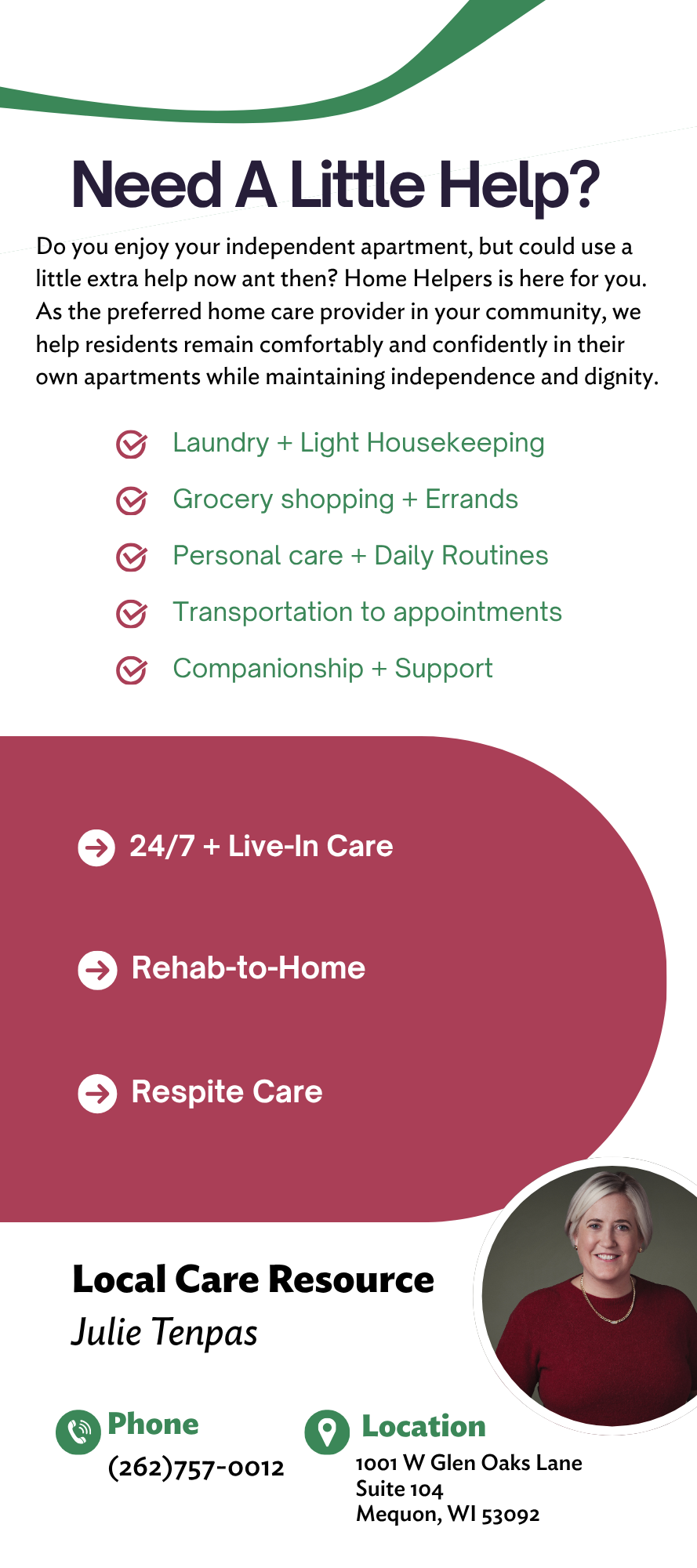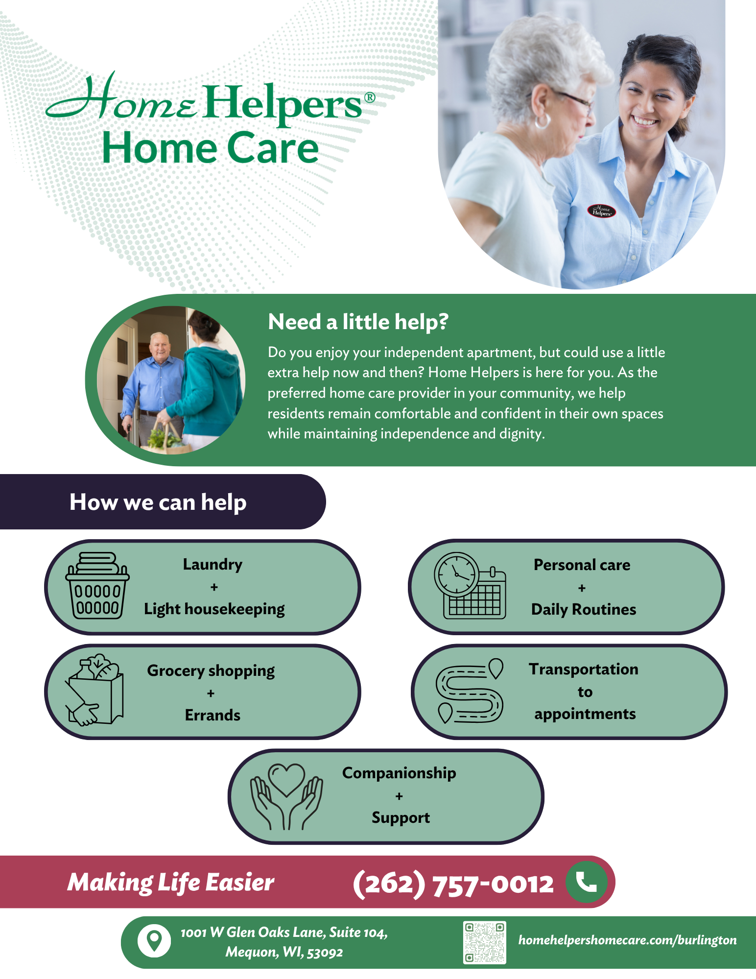 The Mequon + Burlington, WI branch of Home Helpers needed professionally designed marketing materials but lacked direct support from their corporate office. I stepped in to define a clear visual direction while maintaining brand consistency.