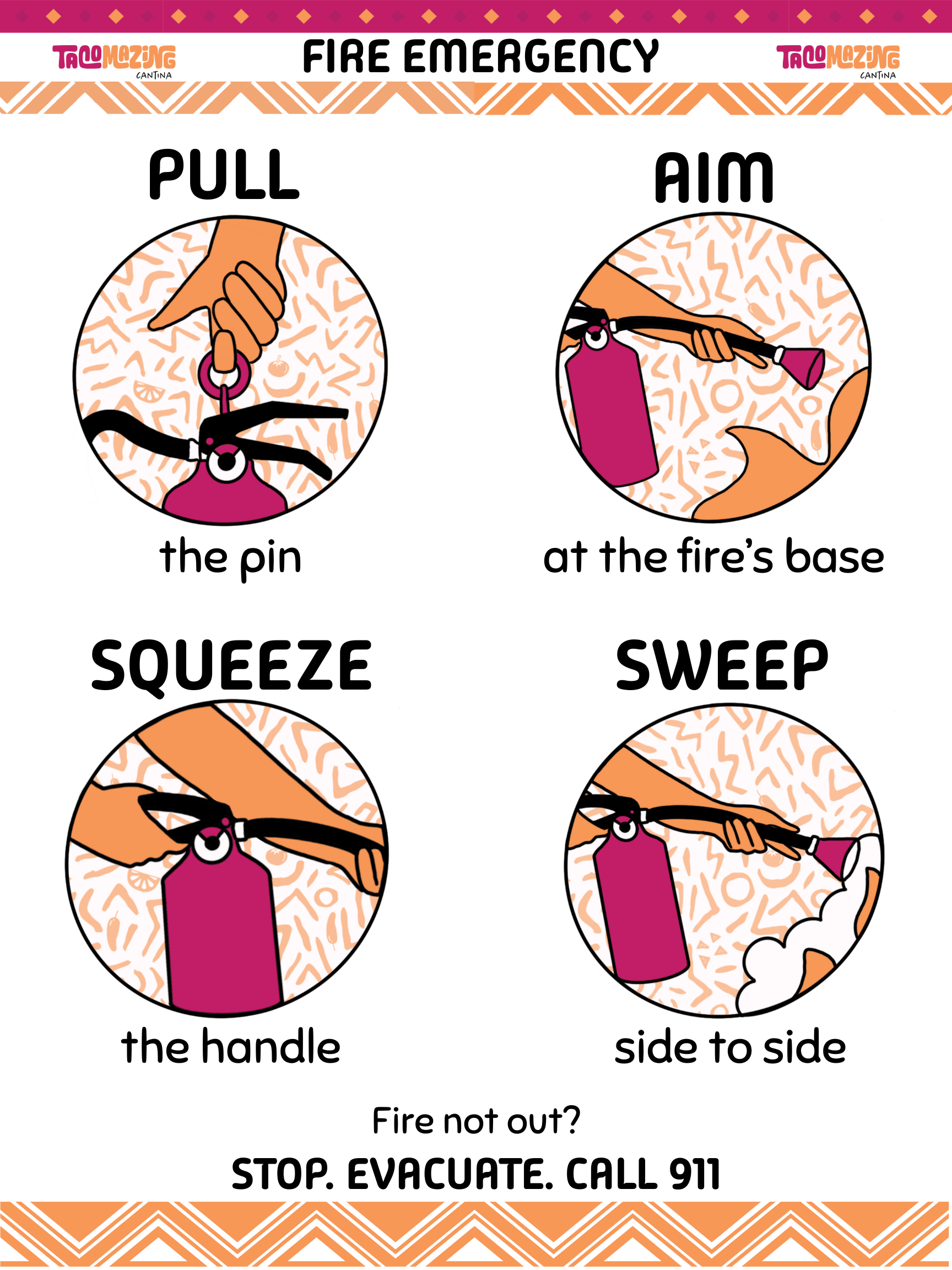 The goal of this job aid was to develop a concise, easy-to-follow fire extinguisher quick reference for TacoMazing Cantina Food Truck employees.